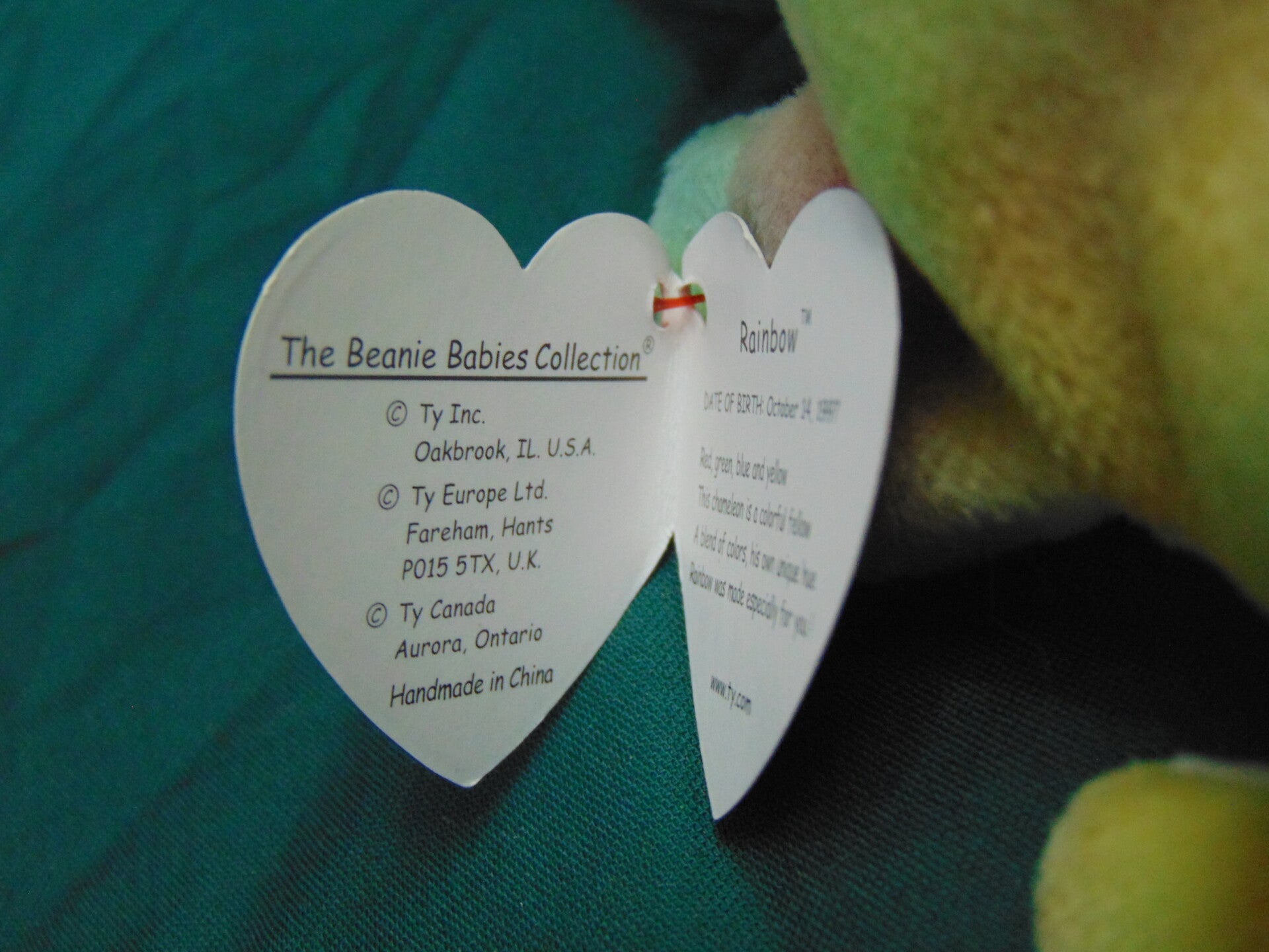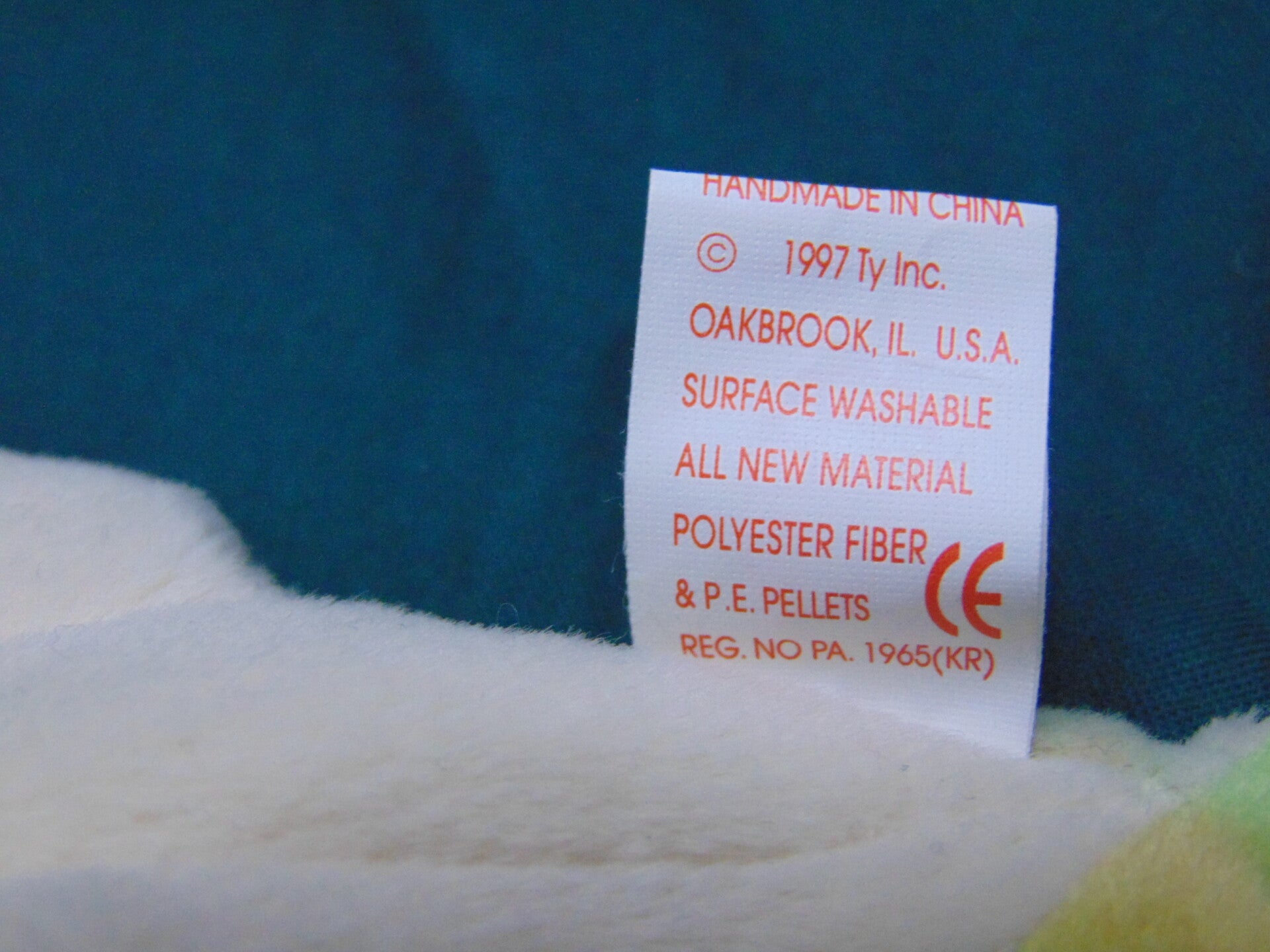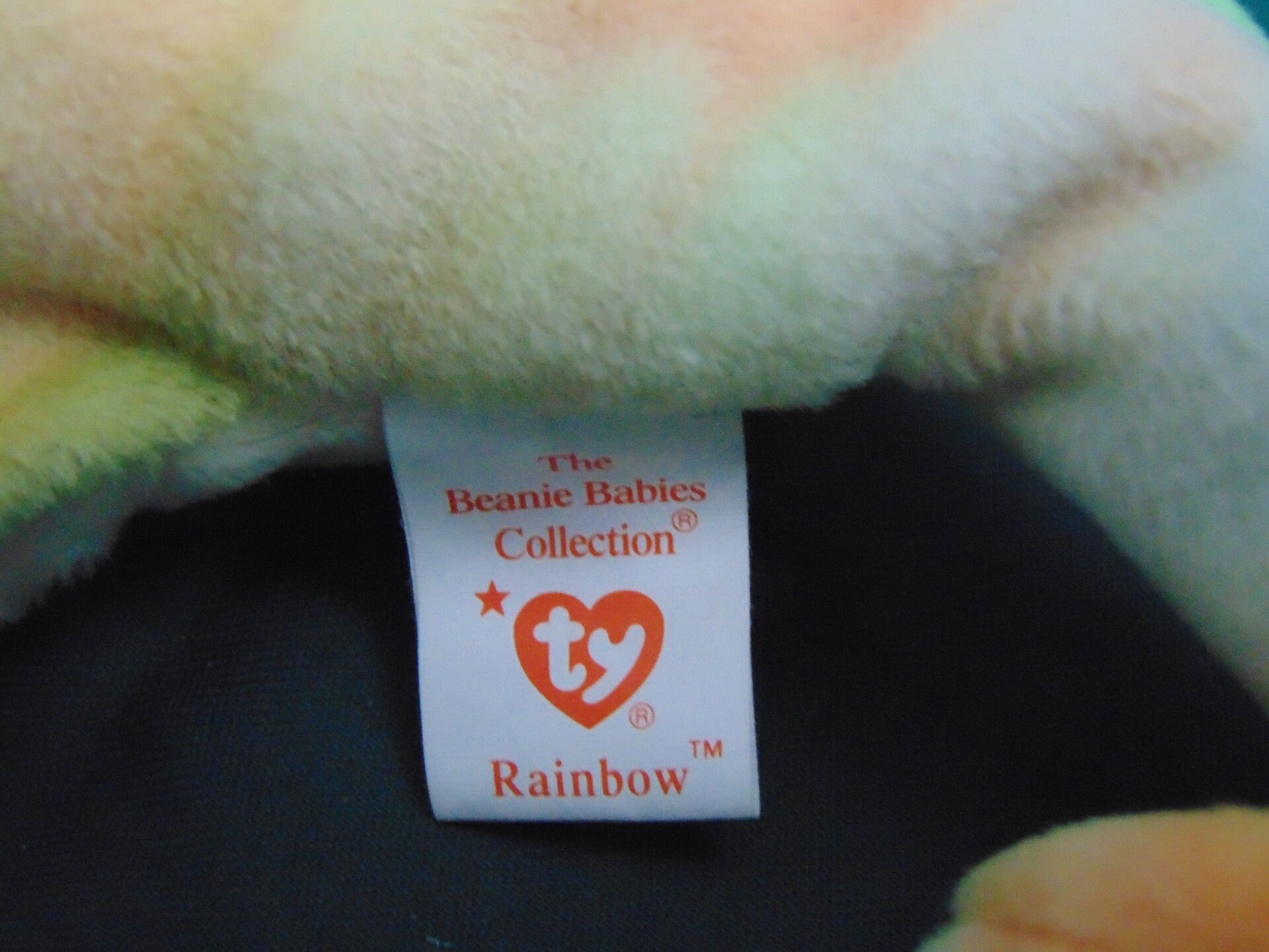 1997 Rainbow right fabric. Although this Ty has the correct fabric there are still many errors collectors look for. Including Fareham hants on swing tag. Extra space at the end of the poem. Oakbrook all one word. Star on tush tag. Fabric tongue oval stamp on tush tag #410. Red eyes not the rare yellow eyes. P.E. pellets not PVC. Reg no 1965(KR) Mint to near mint condition.
