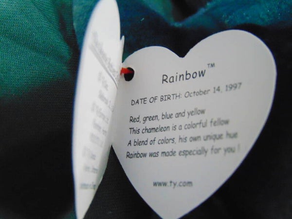 This is a amazing rare Ty good for any coleciton. This is a Rainbow Beanie baby with the wrong fabric has Iggys fabric. With the right swing tag saying rainbow some errors are as. Wrong fabric, two Rs with cirecles on tush tag. Circular stamp on inside of tush P.E. Pellets Reg No 1965(KR) Oakbrook all one word. Swing tag errors Oakbrook all one word Farham Hants and also space between space on end of poem and exclamation. Mint to near mint condition.