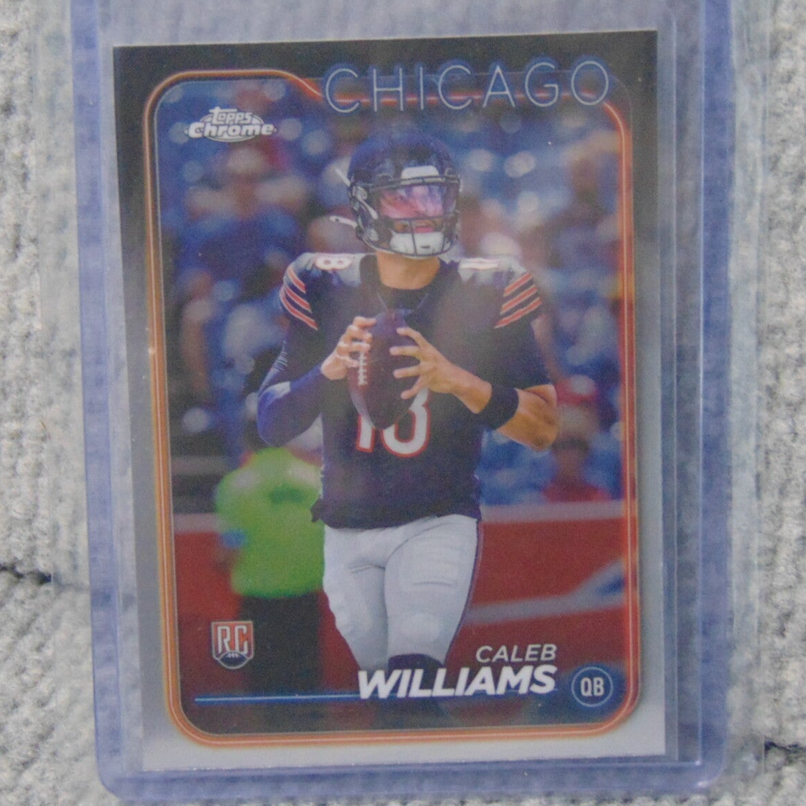 2024 Topps Chrome #202. Amazing Caleb Williams rookie card. Caleb is a quaterback for the Chicago Bears. Nicked named as the Ice Man. He had a terrific year. Showing he could truly play in the NFL. This quarterback should be exciting to whatch for years to come. Mint to near mint condition at a high grade this card could bring in at least $125